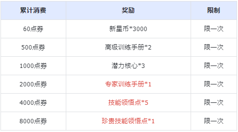 - 玩家通过完成挑战任务增加热度,累计贡献达到一定热度后,可获得[潜力点随机包,高级斗志碎片,花式激活卡,新星币,潜力精华]等奖励,活动结束后全服热度达到150万,个人累计贡献热度超过1000的玩家可获得终极奖励[中高级斗志随机礼盒*1,潜力点随机包*10,高级斗志碎片*5,新星币*1000,金币*1000],活动结束后邮件发放。